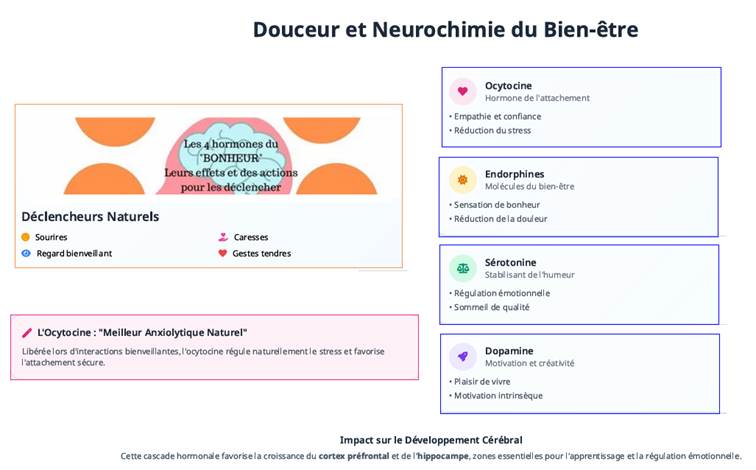 Le schéma ci-dessus explore la connexion entre des interactions douces et les hormones du bien-être, qui sont fondamentales pour notre développement et notre équilibre émotionnel.